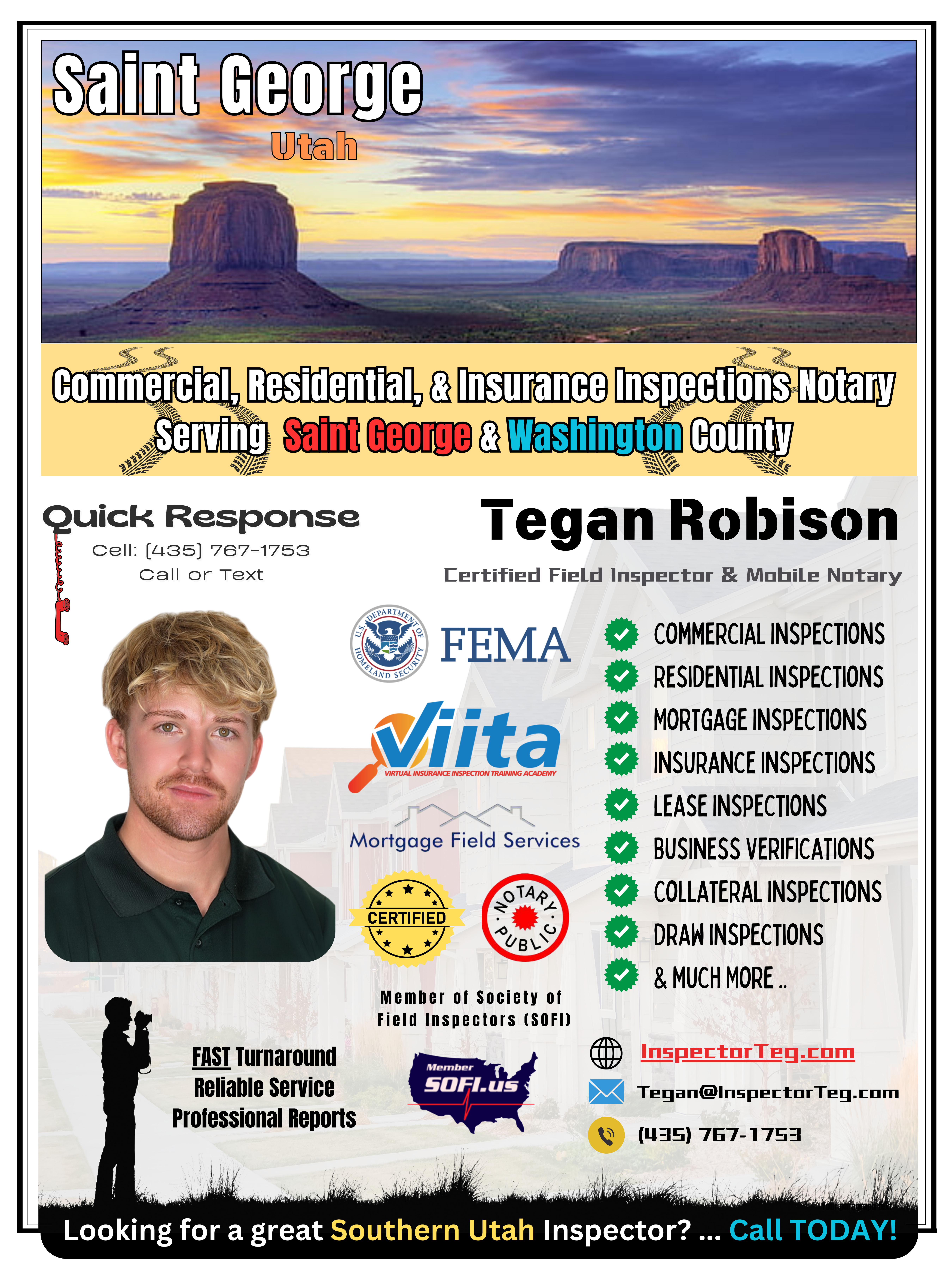 I’m Tegan Robison, a highly motivated Certified Field Inspector and Mobile Notary, eager to support your business with top-quality commercial, residential, and insurance inspections in St. George, Washington County, and beyond. As a sole proprietor, I’m excited to join your team and deliver fast, reliable service.